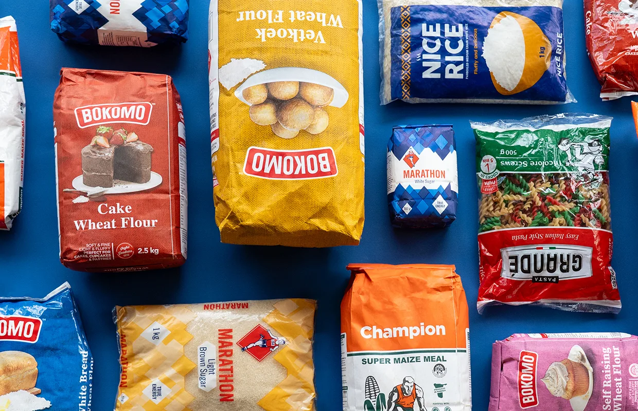 Popular flour and cereal products under the Bokomo brand include Champion maize meal, Bokomo wheat flour, Weet-Bix, and Corn Flakes, alongside Marathon Sugar, Spekko Rice, Nice Rice, Pasta Grande, and White Star instant maize porridge.